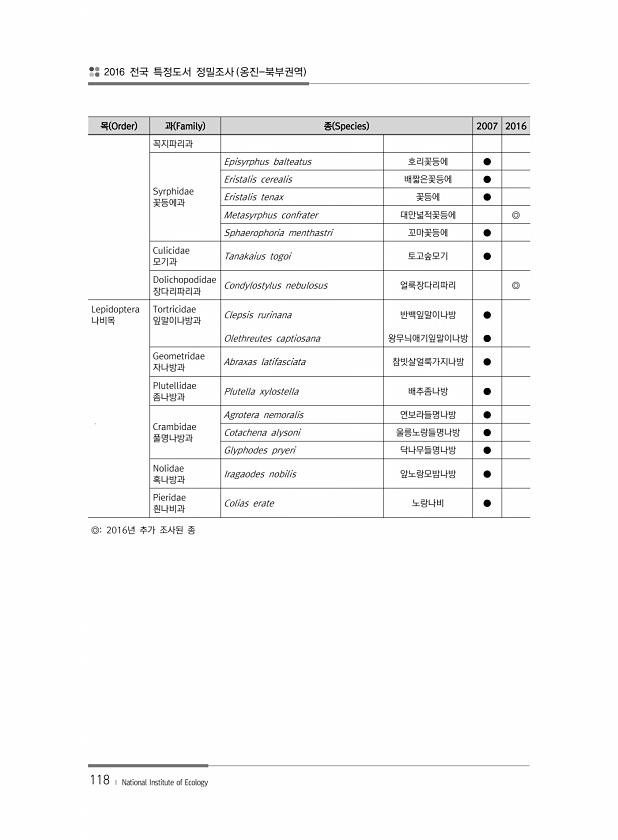 2016 전국 특정도서 정밀조사 옹진-북부권역 118 ? National Institute of Ecology 목 Order 과 Family 종 Species 2007 2016 꼭지파리과 Syrphidae 꽃등에과 Episyrphus balteatus 호리꽃등에 ● Eristalis cerealis 배짧은꽃등에 ● Eristalis tenax 꽃등에 ● Metasyrphus confrater 대만넓적꽃등에 ◎ Sphaerophoria menthastri 꼬마꽃등에 ● Culicidae 모기과 Tanakaius togoi 토고숲모기 ● Dolichopodidae 장다리파리과 Condylostylus nebulosus 얼룩장다리파리 ◎ Lepidoptera 나비목 Tortricidae 잎말이나방과 Clepsis...
