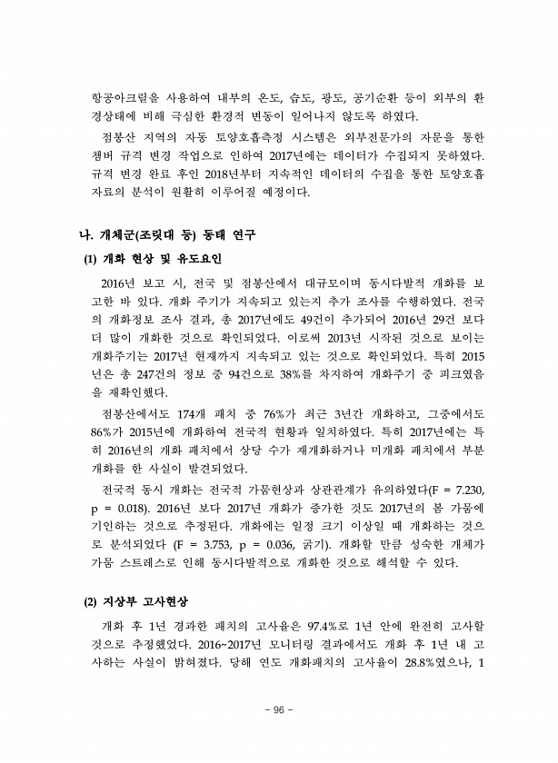 항공아크릴을 사용하여 내부의 온도, 습도, 광도, 공기순환 등이 외부의 환 경상태에 비해 극심한 환경적 변동이 일어나지 않도록 하였다. 점봉산 지역의 자동 토양호흡측정 시스템은 외부전문가의 자문을 통한 챔버 규격 변경 작업으로 인하여 2017년에는 데이터가 수집되지 못하였다. 규격 변경 완료 후인 2018년부터 지속적인 데이터의 수집을 통한 토양호흡 자료의 분석이 원활히 이루어질 예정이다. 나. 개체군 조릿대 등 동태 연구 1 개화 현상 및 유도요인 2016년 보고 시, 전국 및 점봉산에서 대규모이며 동시다발적 개화를 보 고한 바 있다. 개화 주기가 지속되고 있는지 추가 조사를 수행하였다. 전국 의 개화정보 조사 결과, 총 2017년에도 49건이 추가되어 2016년 29건 보다 더 많이 개화한 것으로 확인되...