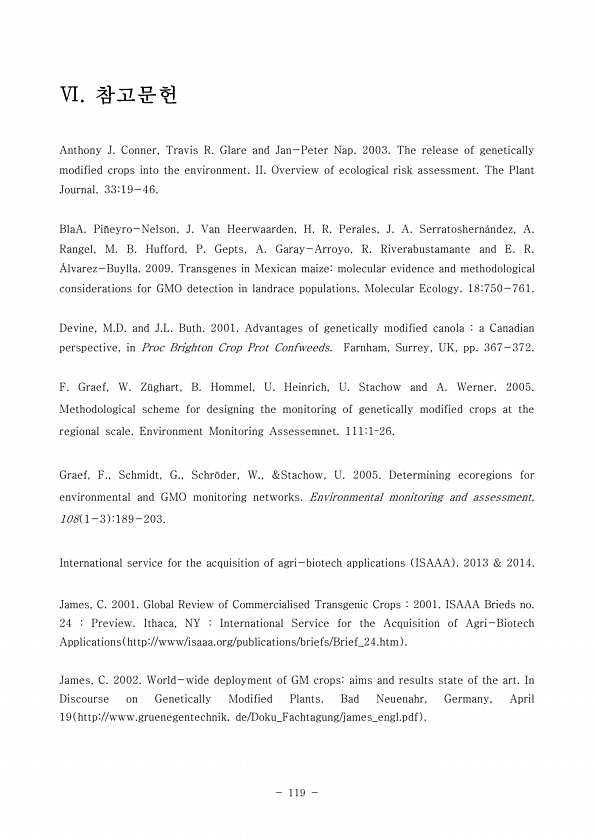 119 Ⅵ. 참고문헌 Anthony J. Conner, Travis R. Glare and Jan-Peter Nap. 2003. The release of genetically modified crops into the environment. II. Overview of ecological risk assessment. The Plant Journal. 3319-46. BlaA. Pi?eyro-Nelson, J. Van Heerwaarden, H. R. Perales, J. A. Serratoshern?ndez, A. Rangel, M. B. Hufford, P. Gepts, A. Garay-Arroyo, R. Riverabustamante and E. R. ?lvarez-Buylla. 2009. Trans...