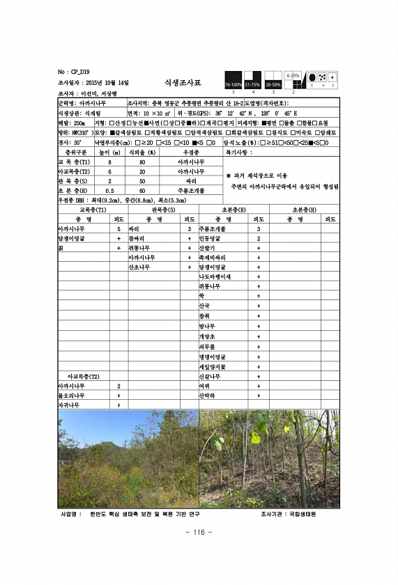 116 No CP_D19 조사일자 2015년 10월 14일 조사자 이선미, 서상령 식생조사표 군락명아까시나무 조사지역충북 영동군 추풍령면 추풍령리 산 18-2 도엽명 격자번호 식생상관식재림 면적10 ×10 ㎡ 위·경도 GPS 36° 12′ 42″N , 128° 0′ 45″E 해발250m 지형□산정□능선■사면 □상□중■하 □계곡□평지 미세지형■평면 □돌출 □함몰□요철 방위NW 310° 토양■갈색삼림토 □적황색삼림토 □암적색삼림토 □회갈색삼림토 □침식토 □미숙토 □암쇄토 경사35° 낙엽부식층 cm □≥20 □ 15 □ 10 ■ 5 □0 암석노 출 % □≥51□ 50□ 25■ 5□0 층위구분 높이 m 식피율 % 우점종 특기사항 교 목 층 T1 8 80 아까시나무 ※ 과거 채석장으로 이용 주변의 아까시나무군락에서 ...