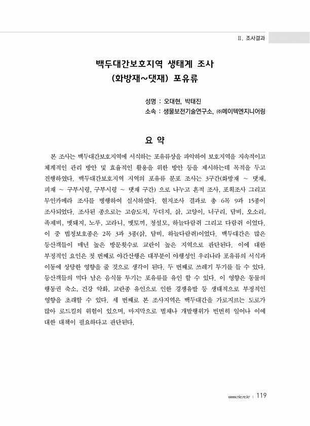 Ⅱ. 조사결과 www.nie.re.kr ? 119 백두대간보호지역 생태계 조사 화방재댓재 포유류 성명 오대현, 박태진 소속 생물보전기술연구소, ㈜메이텍엔지니어링 요 약 본 조사는 백두대간보호지역에 서식하는 포유류상을 파악하여 보호지역을 지속적이고 체계적인 관리 방안 및 효율적인 활용을 위한 방안 등을 제시하는데 목적을 두고 진행하였다. 백두대간보호지역 지역의 포유류 분포 조사는 3구간 화방재 ∼ 댓재, 피재 ∼ 구부시령, 구부시령 ∼ 댓재 구간 으로 나누고 흔적 조사, 포획조사 그리고 무인카메라 조사를 병행하여 실시하였다. 현지조사 결과로 총 6목 9과 15종이 조사되었다. 조사된 종으로는 고슴도치, 두더지, 삵, 고양이, 너구리, 담비, 오소리, 족제비, 멧돼지, 노루, 고라니, 멧토끼, 청설모, 하늘다람...