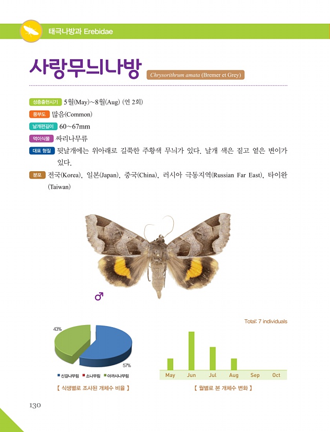 밤나방과 Noctuidae 130 태극나방과 Erebidae 성충출현시기 5월 May 8월 Aug 연 2회 풍부도 많음 Common 날개편길이 6067mm 먹이식물 싸리나무류 대표 형질 뒷날개에는 위아래로 길쭉한 주황색 무늬가 있다. 날개 색은 짙고 옅은 변이가 있다. 분포 전국 Korea , 일본 Japan , 중국 China , 러시아 극동지역 Russian Far East , 타이완 Taiwan 사랑무늬나방 Chrysorithrum amata Bremer et Grey 【 식생별로 조사된 개체수 비율 】 43% 신갈나무림 소나무림 아까시나무림 57% 【 월별로 본 개체수 변화 】 Total7 individuals May Jun Jul Aug SepOct