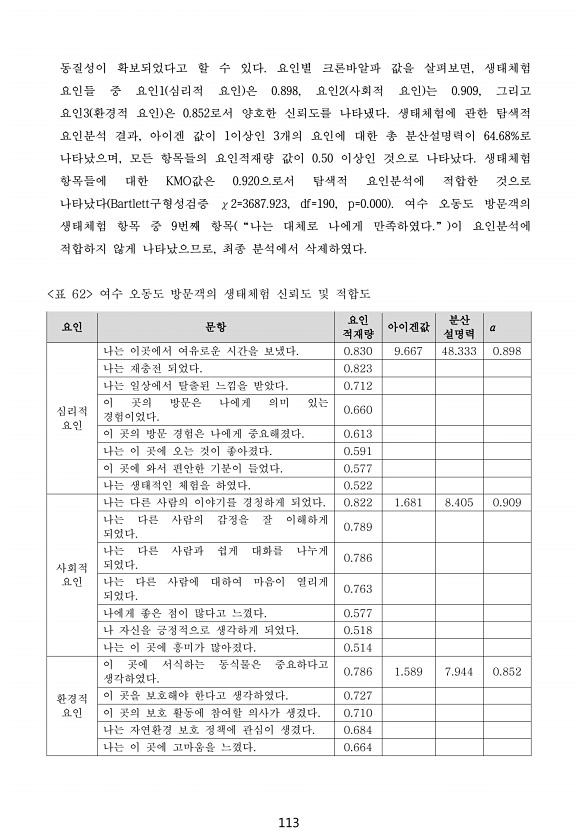 113 동질성이 확보되었다고 할 수 있다. 요인별 크론바알파 값을 살펴보면, 생태체험 요인들 중 요인1 심리적 요인 은 0.898, 요인2 사회적 요인 는 0.909, 그리고 요인3 환경적 요인 은 0.852로서 양호한 신뢰도를 나타냈다. 생태체험에 관한 탐색적 요인분석 결과, 아이겐 값이 1이상인 3개의 요인에 대한 총 분산설명력이 64.68%로 나타났으며, 모든 항목들의 요인적재량 값이 0.50 이상인 것으로 나타났다. 생태체험 항목들에 대한 KMO값은 0.920으로서 탐색적 요인분석에 적합한 것으로 나타났다 Bartlett구형성검증 χ2=3687.923, df=190, p=0.000 여수 오동도 방문객의 생태체험 항목 중 9번째 항목 “나는 대체로 나에게 만족하였다.” 이 요인분석에 적합하지 않게 나타...