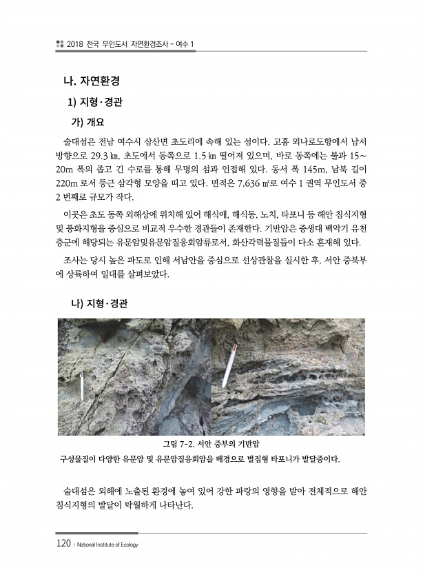 2018 전국 무인도서 자연환경조사 여수 1 120 ? National Institute of Ecology 1 · 술대섬은 전남 여수시 삼산면 초도리에 속해 있는 섬이다. 고흥 외나로도항에서 남서 방향으로 29.3 ㎞, 초도에서 동쪽으로 1.5 ㎞ 떨어져 있으며, 바로 동쪽에는 불과 15∼ 20m 폭의 좁고 긴 수로를 통해 무명의 섬과 인접해 있다. 동서 폭 145m, 남북 길이 220m 로서 둥근 삼각형 모양을 띠고 있다. 면적은 7,636 ㎡로 여수 1 권역 무인도서 중 2 번째로 규모가 작다. 이곳은 초도 동쪽 외해상에 위치해 있어 해식애, 해식동, 노치, 타포니 등 해안 침식지형 및 풍화지형을 중심으로 비교적 우수한 경관들이 존재한다. 기반암은 중생대 백악기 유천 층군에 해당되는 유문암및유문암질응회...