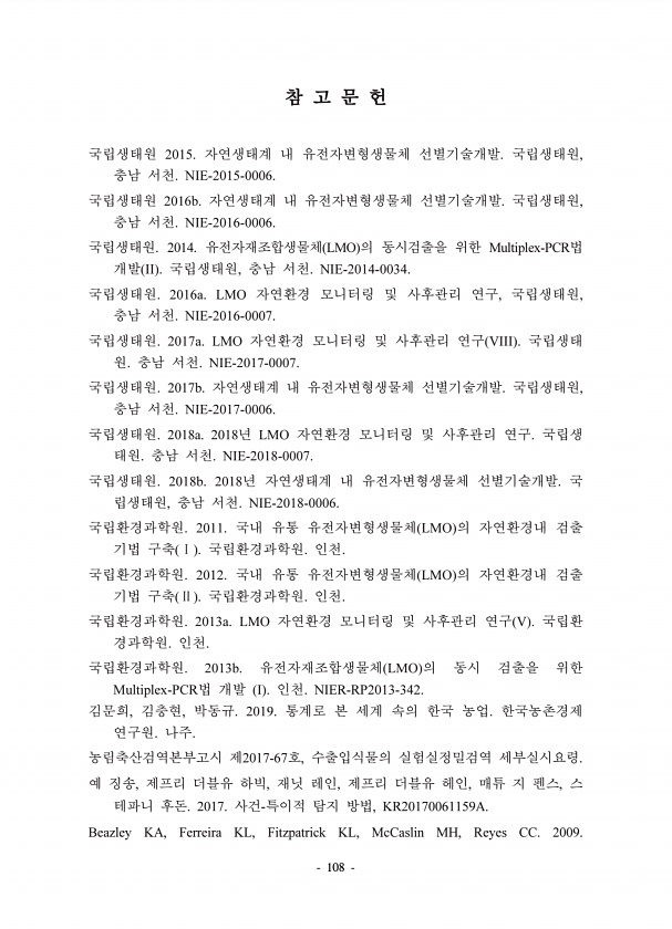 108 2015. , NIE-2015-0006. 2016b. , NIE-2016-0006. 2014. LMO Multiplex-PCR II , NIE-2014-0034. 2016a. LMO , , NIE-2016-0007. 2017a. LMO VIII NIE-2017-0007. 2017b. , NIE-2017-0006. 2018a. 2018 LMO NIE-2018-0007. 2018b. 2018 , NIE-2018-0006. 2011. LMO 2012. LMO 2013a. LMO V 2013b. LMO Multiplex-PCR I NIER-RP2013-342. , , 2019. 2017-67 , , , , , , 2017. , KR20170061159A. Beazley KA, Ferreira KL, Fitz...