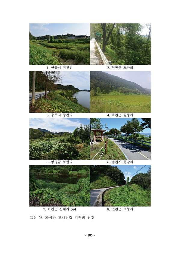 106 1. 안동시 저전리 2. 영동군 호탄리 3. 충주시 중청리 4. 옥천군 원동리 5. 양평군 회현리 6. 춘천시 현암리 7. 화천군 신대리 524 8. 연천군 고능리 그림 26. 가시박 모니터링 지역의전경
