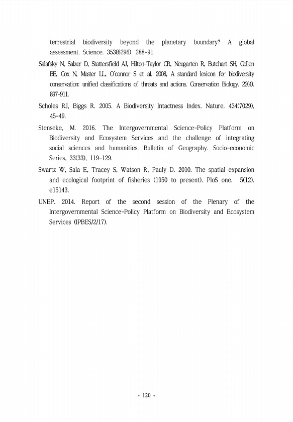 terrestrial biodiversity beyond the planetary boundary? A global assessment. Science. 353 6296 288-91. Salafsky N, Salzer D, Stattersfield AJ, Hilton-Taylor CR, Neugarten R, Butchart SH, Collen BE, Cox N, Master LL, Oconnor S et al. 2008, A standard lexicon for biodiversity conservationunified classifications of threats and actions. Conservation Biology. 22 4 897-911. Scholes RJ, Biggs R. 2005. A ...