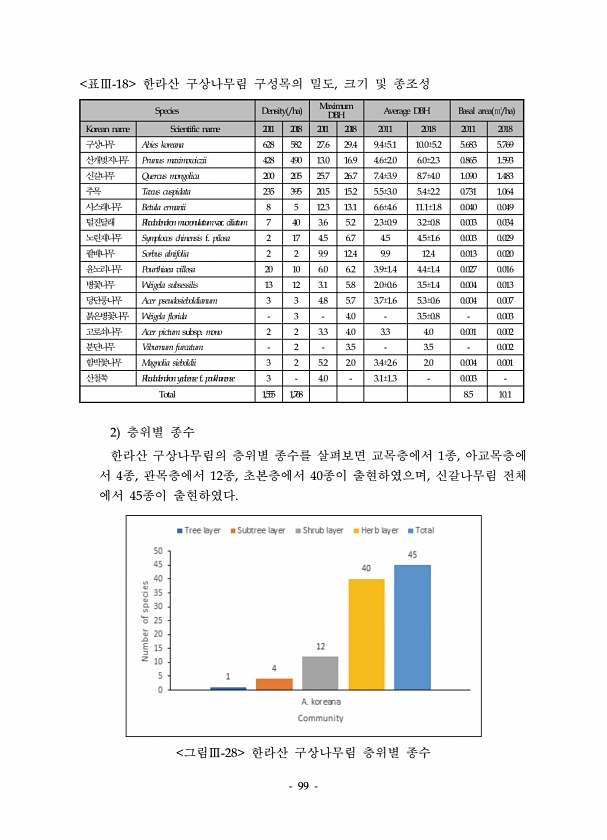 99 Species Density /ha Maximum DBH Average DBH Basal area ㎡/ha Korean name Scientific name 2011 2018 2011 2018 2011 2018 2011 2018 구상나무 Abies koreana 628 582 27.6 29.4 9.4±5.1 10.0±5.2 5.683 5.769 산개벚지나무 Prunus maximowiczii 428 490 13.0 16.9 4.6±2.0 6.0±2.3 0.865 1.593 신갈나무 Quercus mongolica 200 205 25.7 26.7 7.4±3.9 8.7±4.0 1.090 1.483 주목 Taxus cuspidata 235 395 20.5 15.2 5.5±3.0 5.4±2.2 0.731 1....