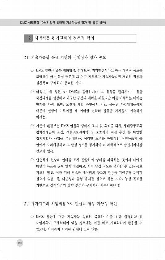 110 DMZ 생태포럼 DMZ 일원 생태적 지속가능성 평가 및 활용 방안 2 시범적용 평가결과의 정책적 함의 2.1. 지속가능성 목표 기반의 정책성과 평가 중요 ○ DMZ 일원은 남북 평화협력, 생태보전, 지역발전이라고 하는 다면적 목표를 포괄해야 하는 특성 때문에 그 어떤 지역보다 지속가능발전 개념의 적용과 실천목표 구체화가 중요한 지역. ○ 더욱이, 매 정권마다 DMZ를 활용하거나 그 위상을 변화시키기 위한 국정과제를 설정하고 다양한 구상과 계획을 세웠지만 이를 이행하는 데에는 한계를 가짐. 또한, 보전과 개발 측면에서 서로 상충된 사업계획들이기 때문에 실행이 이루어질 때 어떠한 변화와 갈등을 가져올지 예측하기 어려움. ○ 기존에 환경부는 DMZ 일원의 생태계 조사 및 외래종 퇴치, 생태탐방로와 평화생태...