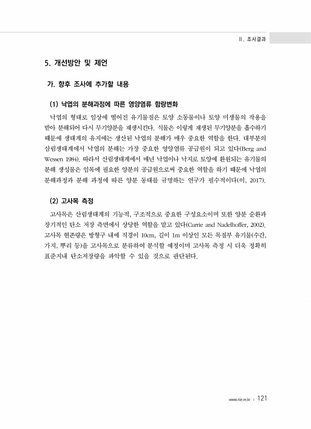 Ⅱ. 조사결과 www.nie.re.kr ? 121 5. 개선방안 및 제언 가. 향후 조사에 추가할 내용 1 낙엽의 분해과정에 따른 영양염류 함량변화 낙엽의 형태로 임상에 떨어진 유기물질은 토양 소동물이나 토양 미생물의 작용을 받아 분해되어 다시 무기양분을 재생시킨다. 식물은 이렇게 재생된 무기양분을 흡수하기 때문에 생태계의 유지에는 생산된 낙엽의 분해가 매우 중요한 역할을 한다. 대부분의 삼림생태계에서 낙엽의 분해는 가장 중요한 영양염류 공급원이 되고 있다 Berg and Wessen 1984 따라서 산림생태계에서 매년 낙엽이나 낙지로 토양에 환원되는 유기물의 분해 생성물은 임목에 필요한 양분의 공급원으로써 중요한 역할을 하기 때문에 낙엽의 분해과정과 분해 과정에 따른 양분 동태를 규명하는 연구가 필수적이다...