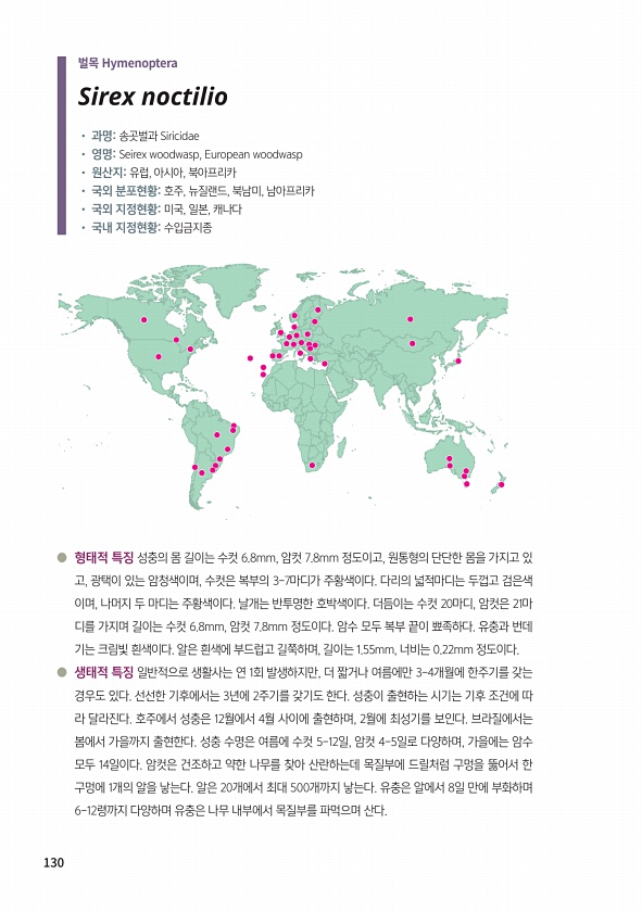 130 ● 형태적 특징 성충의 몸 길이는 수컷 6.8mm, 암컷 7.8mm 정도이고, 원통형의 단단한 몸을 가지고 있 고, 광택이 있는 암청색이며, 수컷은 복부의 3-7마디가 주황색이다. 다리의 넓적마디는 두껍고 검은색 이며, 나머지 두 마디는 주황색이다. 날개는 반투명한 호박색이다. 더듬이는 수컷 20마디, 암컷은 21마 디를 가지며 길이는 수컷 6.8mm, 암컷 7.8mm 정도이다. 암수 모두 복부 끝이 뾰족하다. 유충과 번데 기는 크림빛 흰색이다. 알은 흰색에 부드럽고 길쭉하며, 길이는 1.55mm, 너비는 0.22mm 정도이다. ● 생태적 특징 일반적으로 생활사는 연 1회 발생하지만, 더 짧거나 여름에만 3-4개월에 한주기를 갖는 경우도 있다. 선선한 기후에서는 3년에 2주기를 갖기도 한다. 성충이 ...