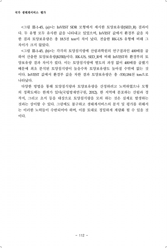 국가 생태계서비스 평가 112 그림 Ⅲ-1-45, a 는 InVEST SDR 모형에서 제시한 토양보유량 SED_R 결과이 다. 두 유형 모두 유사한 값을 나타내고 있었으며, InVEST 값에서 환경부 값을 차 한 결과 토양보유량은 총 18.5천 ton이 차이 났다. 전술한 RK-US 유형에 비해 그 차이가 크지 않았다. 그림 Ⅲ-1-45, b 는 각각의 토양침식량에 산림과학원의 연구결과인 400배를 곱 하여 산출한 토양보유량 KFRI 이다. RK-US, SED_R에 비해 InVEST와 환경부의 토 양보유량 결과 차이가 컸다. 이는 토양침식량에 별도의 과정 없이 400배를 곱했기 때문에 최초 분석된 토양침식량이 높을수록 토양보유량도 높아질 수밖에 없는 것 이다. InVEST 값에서 환경부 값을 차한 결과 토양...