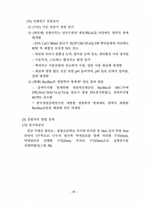 81 다 선행연구 문헌조사 ? 기온 기온 상승시 생장 증가 ? 제설제 산벚나무는 낮은수준의 제설제 CaCl 처리에도 생리적 장애 발생함 0.5% CaCl 500ml 잎나기 전 ‘07.3.29/’07.4.5 2회 뿌리둘레에 처리에도 80일 후 광합성 보상점 54% 감소 제설제 처리시 광합성 능력, 빛이용 능력 감소, 생리활성 거의 정지됨 이온독성, 스트레스 활성산소 발생 증가 뿌리부근 수분포텐셜 감소하여 수분, 양분 이동 불균형 발생함 제설제 영향 많은 곳은 토양 pH 높아지며, pH 높은 곳에서 잎마름, 갈변 발생함 ? 병해 Bacillus균 생물학적 방제제* 살포 효과 있음 갈색무늬병 방제위해 생장촉진세균인 Bacillus균 100그루에 2번 ‘10.6/’10.8/‘11.4/’11.6 살포시 생장 10%증...