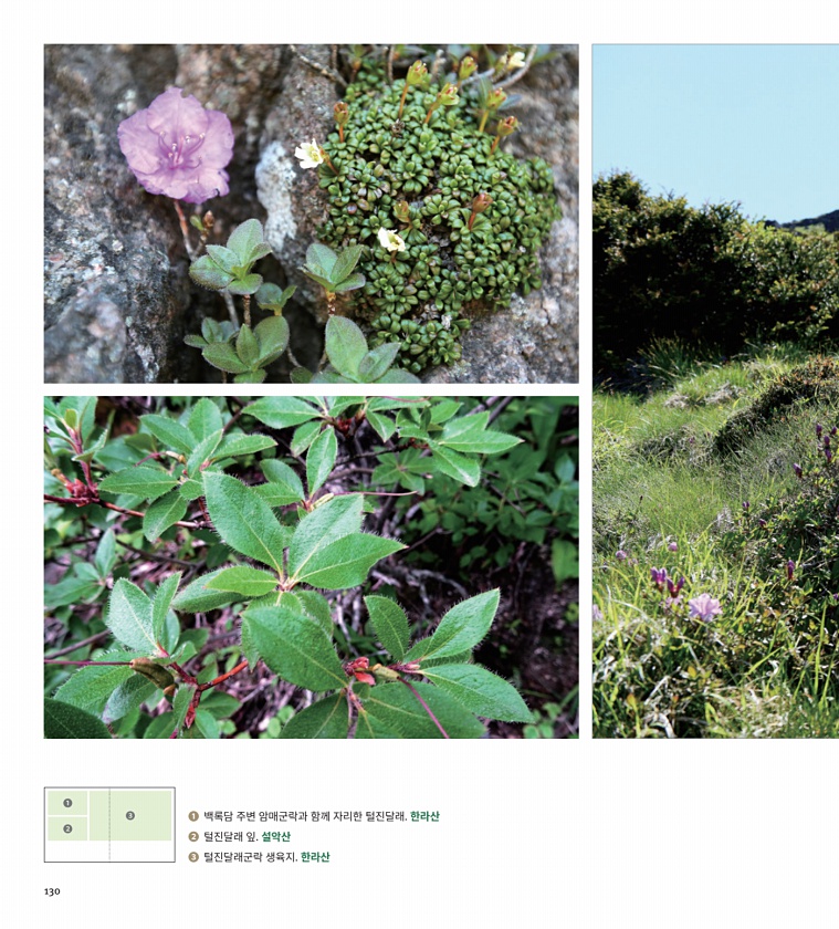 ? ?? ? 백록담 주변 암매군락과 함께 자리한 털진달래. 한라산 ? 털진달래 잎. 설악산 ? 털진달래군락 생육지. 한라산130