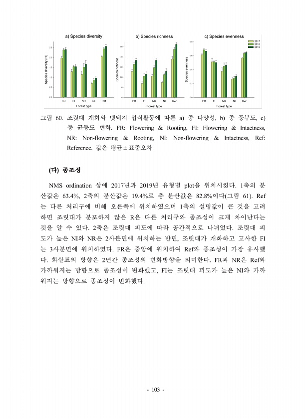103 60. a , b , c FRFlowering & Rooting, FIFlowering & Intactness, NRNon-flowering & Rooting, NINon-flowering & Intactness, RefReference. ± NMS ordination 2017 2019 plot 1 63.4%, 2 19.4% 82.8% 61 Ref 1 R 2 NI NR 2 , FI 3 FR Ref 2 FR NR Ref , FI NI
