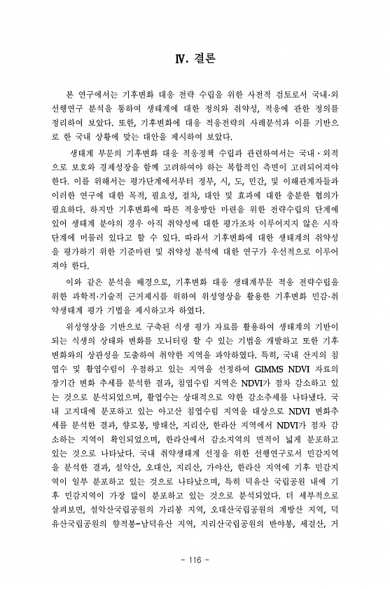 116 결론 본 연구에서는 기후변화 대응 전략 수립을 위한 사전적 검토로서 국내 외 선행연구 분석을 통하여 생태계에 대한 정의와 취약성 적응에 관한 정의를 정리하여 보았다 또한 기후변화에 대응 적응전략의 사례분석과 이를 기반으 로 한 국내 상황에 맞는 대안을 제시하여 보았다 생태계 부문의 기후변화 대응 적응정책 수립과 관련하여서는 국내·외적 으로 보호와 경제성장을 함께 고려하여야 하는 복합적인 측면이 고려되어져야 한다. 이를 위해서는 평가단계에서부터 정부 시 도 민간 및 이해관계자들과 이러한 연구에 대한 목적 필요성 절차 대안 및 효과에 대한 충분한 협의가 필요하다 하지만 기후변화에 따른 적응방안 마련을 위한 전략수립의 단계에 있어 생태계 분야의 경우 아직 취약성에 대한 평가조차 이루어지지 않은 시작 단계에...