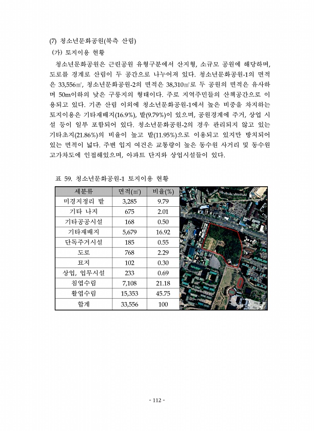 112 청소년문화공원 북측 산림 가 토지이용 현황 청소년문화공원은 근린공원 유형구분에서 산지형 소규모 공원에 해당하며 도로를 경계로 산림이 두 공간으로 나누어져 있다 청소년문화공원 의 면적 은 청소년문화공원 의 면적은 로 두 공원의 면적은 유사하 며 이하의 낮은 구릉지의 형태이다 주로 지역주민들의 산책공간으로 이 용되고 있다 기존 산림 이외에 청소년문화공원 에서 높은 비중을 차지하는 토지이용은 기타재배지 밭 이 있으며 공원경계에 주거 상업 시 설 등이 일부 포함되어 있다 청소년문화공원 의 경우 관리되지 않고 있는 기타초지 의 비율이 높고 밭 으로 이용되고 있지만 방치되어 있는 면적이 넓다 주변 입지 여건은 교통량이 높은 동수원 사거리 및 동수원 고가차도에 인접해있으며 아파트 단지와 상업시설들이 있다 세분류 ...