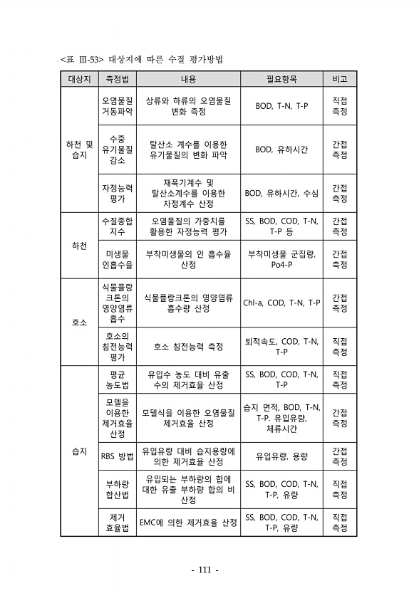 대상지 측정법 내용 필요항목 비고 하천 및 습지 오염물질 거동파악 상류와 하류의 오염물질 변화 측정 BOD, T-N, T-P 직접 측정 수중 유기물질 감소 탈산소 계수를 이용한 유기물질의 변화 파악 BOD, 유하시간 간접 측정 자정능력 평가 재폭기계수 및 탈산소계수를 이용한 자정계수 산정 BOD, 유하시간, 수심 간접 측정 하천 수질종합 지수 오염물질의 가중치를 활용한 자정능력 평가 SS, BOD, COD, T-N, T-P 등 간접 측정 미생물 인흡수율 부착미생물의 인 흡수율 산정 부착미생물 군집량, Po4-P 간접 측정 호소 식물플랑 크톤의 영양염류 흡수 식물플랑크톤의 영양염류 흡수량 산정 Chl-a, COD, T-N, T-P 간접 측정 호소의 침전능력 평가 호소 침전능력 측정 퇴적속도, COD, T-N,...