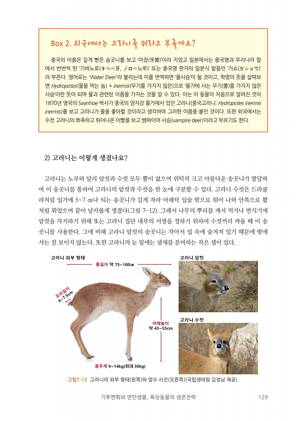 기후변화와 연안생물, 육상동물의 생존전략 129 2 고라니는 어떻게 생겼나요? 고라니는 노루와 달리 암컷과 수컷 모두 뿔이 없으며 위턱의 크고 아름다운 송곳니가 발달하 여 이 송곳니를 통하여 고라니의 암컷과 수컷을 한 눈에 구분할 수 있다. 고라니 수컷은 드라큘 라처럼 입가에 57 ㎝나 되는 송곳니가 길게 자라 아래턱 입술 밖으로 튀어 나와 안쪽으로 활 처럼 휘었으며 끝이 날카롭게 생겼다 그림 7-12 그래서 나무의 뿌리를 캐서 먹거나 번식기에 암컷을 차지하기 위해 또는 고라니 집단 내부의 서열을 정하기 위하여 수컷끼리 싸울 때 이 송 곳니를 사용한다. 그에 비해 고라니 암컷의 송곳니는 작아서 입 속에 숨겨져 있기 때문에 밖에 서는 잘 보이지 않는다. 또한 고라니의 눈 밑에는 냄새를 분비하는 작은 샘이 있다...