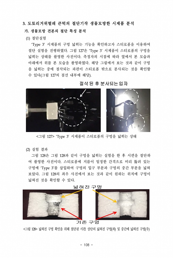 108 3. 도토리거위벌레 큰턱의 절단기작 생물모방한 시제품 분석 가. 생물모방 견본의 절단 특성 분석 1 절단실험 ‘Type 3’ 시제품의 구멍 넓히는 기능을 확인하고자 스티로폼을 이용하여 절단 실험을 진행하였다. 그림 127은 ‘Type 3’ 시제품이 스티로폼의 구멍을 넓히는 상태를 촬영한 사진이다. 측정자의 시점에 따라 옆에서 본 모습과 아래에서 위를 본 모습을 촬영하였다. 해당 그림에서 보는 것과 같이 구멍 을 넓히는 중에 절삭되는 파편이 스티로폼 밖으로 분사되는 것을 확인할 수 있다 그림 127의 점선 내부에 해당 그림 127 ‘Type 3’ 시제품이 스티로폼의 구멍을 넓히는 상태 2 실험 결과 그림 128은 그림 128과 같이 구멍을 넓히는 실험을 한 후 시편을 절단하 여 촬영한 사진이다. 스티로...