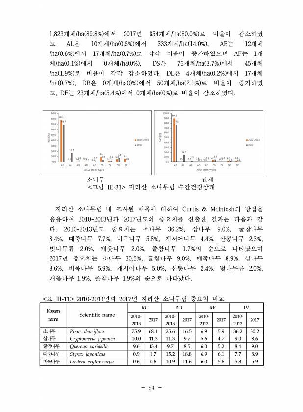 94 1,823개체/ha 89.8% 에서 2017년 854개체/ha 80.0% 로 비율이 감소하였 고 AL은 10개체/ha 0.5% 에서 333개체/ha 14.0% , AB는 12개체 /ha 0.6% 에서 17개체/ha 0.7% 로 각각 비율이 증가하였으며 AF는 1개 체/ha 0.1% 에서 0개체/ha 0% , DS은 76개체/ha 3.7% 에서 45개체 /ha 1.9% 로 비율이 각각 감소하였다. DL은 4개체/ha 0.2% 에서 17개체 /ha 0.7% , DB은 0개체/ha 0% 에서 50개체/ha 2.1% 로 비율이 증가하였 고, DF는 23개체/ha 5.4% 에서 0개체/ha 0% 로 비율이 감소하였다. 소나무 전체 그림 Ⅲ-31 지리산 소나무림 수간건강상태 지리산 소나무림 내 조사된 매목에 대하...