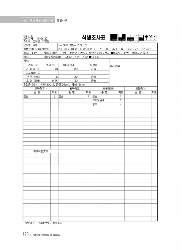 전국 해안사구 정밀조사 맹방사구 120 ? National Institute of Ecology No 31 조사일자 15.06.27. 조사자전지영, 조영준 식생조사표 군락명곰솔 조사지역맹방사구 9구간 식생상관상록침엽수림 면적10 x 10 ㎡ 위?경도 GPS 37° 38′ 96.11″N, 129° 22′ 87.76E 해발13m 지형□해빈 □전사구 전면부 □전사구 후면부 □사구저지 ■배후사구 전면 □배후사구 후면 방위낙엽부식층 cm □.≥20 □ 15 □ 10 ■ 5 □0 경사계층구분 높이 m 식피율 % 우점종 특기사항교 목 층 T1 18 80 곰솔 아교목층 T2 관 목 층 S 6 20 곰솔 초 본 층 H 0.25 30 곰솔 우점종 DBH 최대 30cm , 중간 26cm , 최소 18cm 교목층 T1 관목층 S...
