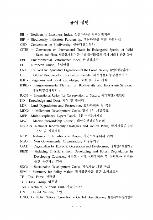 용어 설명 BII ? Biodiversity Intactness Index, 생물다양성 원형보전지수 BIP ? Biodiversity Indicators Partnership, 생물다양성 지표 파트너십 CBD Convention on Biodiversity, 생물다양성협약 CITES ? Convention on International Trade in Endangered Species of Wild Fauna and Flora, 멸종위기에 처한 야생 동·식물종의 국제 거래에 관한 협약 EPI ? Environmental Performance Index, 환경성과지수 EU ? European Union, 유럽연합 FAO ? The Food and Agriculture Organization of the Uni...