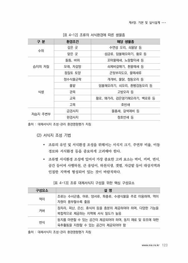 www.nie.re.kr 123 제4장. 기본 및 실시설계 [표 4-12] 조류의 서식환경에 따른 생물종 구 분 환경조건 해당 생물종 수위 깊은 곳 수면성 오리, 쇠물닭 등 얕은 곳 섭금류, 덤불해오라기, 황로 등 습지의 저질 돌틈, 바위 꼬마물떼새, 노랑할미새 등 모래, 자갈땅 쇠제비갈매기, 흰물떼새 등 점질토 토양 큰뒷부리도요, 물떼새류 식생 정수식물군락 개개비, 물닭, 청둥오리 등 풀밭 덤불해오라기, 쇠오리, 흰뺨검둥오리 등 관목 고방오리 등 교목 황로, 왜가리, 검은댕기해오라기, 백로류 등 고목 호반새 저습지 주변부 급경사지 물총새, 갈색제비 등 완경사지 청호반새 등 출처 대체서식지 조성?관리 환경영향평가 지침 2 서식지 조성 기법 조류의 유인 및 서식환경 조성을 위해서는 서식지 크기, 주연부 비율,...