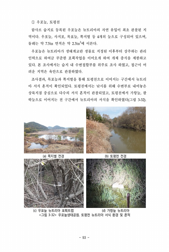 ① 우포늪, 토평천 람사르 습지로 등록된 우포늪은 뉴트리아의 자연 유입이 최초 관찰된 지 역이다. 우포늪, 사지포, 목표늪, 쪽지벌 등 4개의 늪으로 구성되어 있으며, 둘레는 약 7.5㎞ 면적은 약 2.3㎞2에 이른다. 우포늪은 뉴트리아가 생태계교란 생물로 지정된 이후부터 상주하는 관리 인력으로 하여금 꾸준한 포획작업을 이어오게 하여 개체 증식을 제한하고 있다. 본 조사에서는 습지 내 수변접합부를 위주로 조사 하였고, 접근이 어 려운 지역은 육안으로 관찰하였다. 조사결과, 목포늪과 쪽지벌을 통해 토평천으로 이어지는 구간에서 뉴트리 아 서식 흔적이 확인되었다. 토평천에서는 낚시를 위해 수변부로 내어놓은 상륙지점 중심으로 다수의 서식 흔적이 관찰되었고, 토평천에서 가항늪, 팔 락늪으로 이어지는 전 구간에서 뉴트...