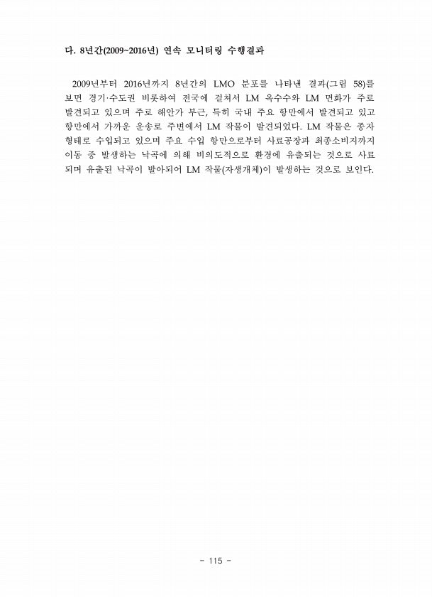 다. 8년간 20092016년 연속 모니터링 수행결과 2009년부터 2016년까지 8년간의 LMO 분포를 나타낸 결과 그림 58 를 보면 경기·수도권 비롯하여 전국에 걸쳐서 LM 옥수수와 LM 면화가 주로 발견되고 있으며 주로 해안가 부근, 특히 국내 주요 항만에서 발견되고 있고 항만에서 가까운 운송로 주변에서 LM 작물이 발견되었다. LM 작물은 종자 형태로 수입되고 있으며 주요 수입 항만으로부터 사료공장과 최종소비지까지 이동 중 발생하는 낙곡에 의해 비의도적으로 환경에 유출되는 것으로 사료 되며 유출된 낙곡이 발아되어 LM 작물 자생개체 이 발생하는 것으로보인다.