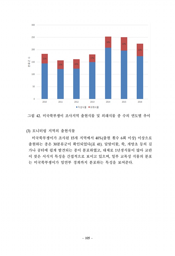 105 그림 42. 미국쑥부쟁이 조사지역 출현식물 및 외래식물 종 수의 연도별 추이 3 모니터링 지역의 출현식물 미국쑥부쟁이가 조사된 15개 지역에서 40% 출현 횟수 6회 이상 이상으로 출현하는 종은 30분류군이 확인되었다 표 41 달맞이꽃, 쑥, 개망초 등의 길 가나 공터에 쉽게 발견되는 종이 분포하였고, 대체로 1년생식물이 많아 교란 이 잦은 서식지 특성을 간접적으로 보이고 있으며, 일부 교목성 식물의 분포 는 미국쑥부쟁이가 임연부 경계까지 분포하는 특성을보여준다.