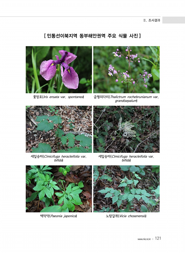 Ⅱ. 조사결과 www.nie.re.kr ? 121 [ 민통선이북지역 동부해안권역 주요 식물 사진 ] 꽃창포 Iris ensata var. spontanea 금꿩의다리 Thalictrum rochebrunianum var. grandisepalum 세잎승마 Cimicifuga heracleifolia var. bifida 세잎승마 Cimicifuga heracleifolia var. bifida 백작약 Paeonia japonica 노랑갈퀴 Vicia chosenensis