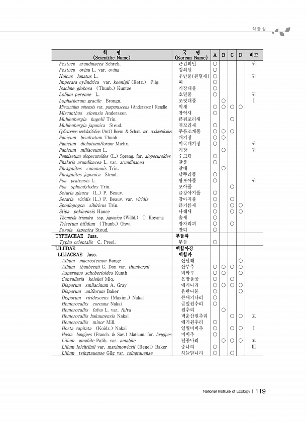 식 물 상 National Institute of EcologyⅠ119 학 명 Scientific Name 국 명 Korean Name A B C D 비고 Festuca arundinacea Schreb. 큰김의털 ○ 귀 Festuca ovina L. var. ovina 김의털 ○ Holcus lanatus L. 우단풀 흰털새 ○ 귀 Imperata cylindrica var. koenigii Retz. Pilg. 띠 ○ Isachne globosa Thunb. Kuntze 기장대풀 ○ Lolium perenne L. 호밀풀 ○ 귀 Lophatherum gracile Brongn. 조릿대풀 ○ Ⅰ Miscanthus sinensis var. purpurascens Andersson Rendle 억새 ○ ○ ...