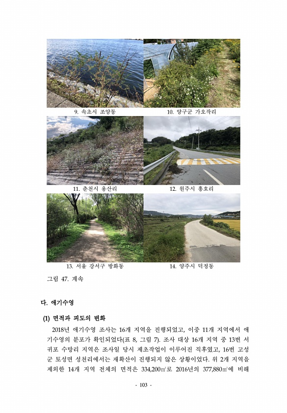 103 9. 속초시 조양동 10. 양구군 가오작리 11. 춘천시 용산리 12. 원주시 흥호리 13. 서울 강서구 방화동 14. 양주시 덕정동 그림 47. 계속 다. 애기수영 1 면적과 피도의 변화 2018년 애기수영 조사는 16개 지역을 진행되었고, 이중 11개 지역에서 애 기수영의 분포가 확인되었다 표 8, 그림 7 조사 대상 16개 지역 중 13번 서 귀포 수망리 지역은 조사일 당시 제초작업이 이루어진 직후였고, 16번 고성 군 토성면 성천리에서는 재확산이 진행되지 않은 상황이었다. 위 2개 지역을 제외한 14개 지역 전체의 면적은 334,200㎡로 2016년의 377,880㎡에비해