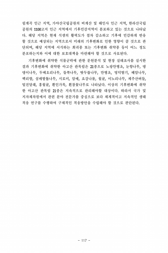 117 림계곡 인근 지역 가야산국립공원의 비계산 및 해인사 인근 지역 한라산국립 공원의 고지 인근 지역에서 기후민감지역이 분포하고 있는 것으로 나타났 다 해당 지역은 현재 식생의 활력도가 점차 감소하고 기후에 민감하게 반응 할 것으로 예상되는 지역으로서 미래의 기후변화로 인한 영향이 클 것으로 판 단되며 해당 지역에 서식하는 희귀종 또는 기후변화 취약종 등이 어느 정도 분포하는지와 이에 대한 보호대책을 마련해야 할 것으로 사료된다 기후변화에 취약한 식물군락에 관한 문헌분석 및 현장 실태조사를 실시한 결과 기후변화에 취약한 아고산 관목림은 종으로 노랑만병초 눈향나무 댕 댕이나무 두메오리나무 들쭉나무 땃두릅나무 만병초 멍덕딸기 배암나무 백리향 섬매발톱나무 시로미 암매 요강나물 월귤 이노리나무 제주산버들 털진달래...