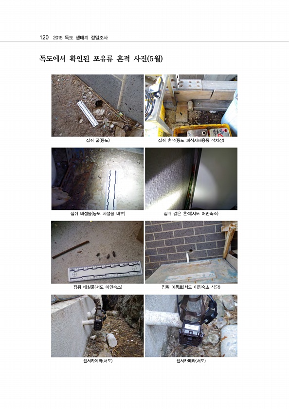 120 2015 독도 생태계 정밀조사 독도에서 확인된 포유류 흔적 사진 5월 집쥐 굴 동도 집쥐 흔적 동도 폐식자재용품 적치장 집쥐 배설물 동도 시설물 내부 집쥐 갉은 흔적 서도 어민숙소 집쥐 배설물 서도 어민숙소 집쥐 이동로 서도 어민숙소 식당 센서카메라 서도 센서카메라 서도