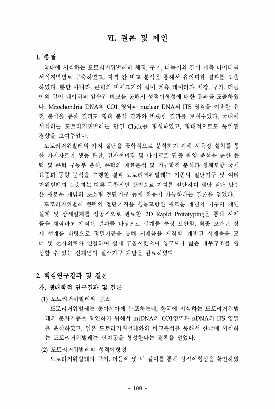 109 Ⅵ. 결론 및 제언 1. 총괄 국내에 서식하는 도토리거위벌레의 체장, 구기, 더듬이의 길이 계측 데이터를 서식지역별로 구축하였고, 지역 간 비교 분석을 통해서 유의미한 결과를 도출 하였다. 뿐만 아니라, 큰턱의 미세크기의 길이 계측 데이터와 체장, 구기, 더듬 이의 길이 데이터의 암수간 비교를 통해서 성적이형성에 대한 결과를 도출하였 다. Mitochondria DNA의 CO1 영역과 nuclear DNA의 ITS 영역을 이용한 유 전 분석을 통한 결과도 형태 분석 결과와 비슷한 결과를 보여주었다. 국내에 서식하는 도토리거위벌레는 단일 Clade를 형성하였고, 형태적으로도 통일된 경향을 보여주었다. 도토리거위벌레의 가지 절단을 공학적으로 분석하기 위해 사육장 설치를 통 한 가지자르기 행동 관찰, 전자...