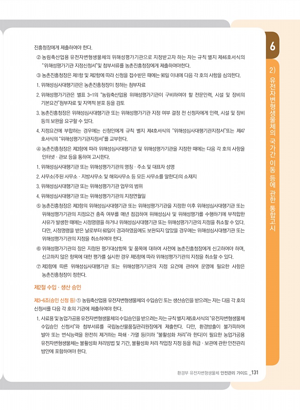 환경부 유전자변형생물체 안전관리 가이드 _131 6 유전자변형생물체의 국가간 이동 등에 관한 통합고시 2 진흥청장에게 제출하여야 한다. ② 농림축산업용 유전자변형생물체의 위해성평가기관으로 지정받고자 하는 자는 규칙 별지 제46호서식의 “위해성평가기관 지정신청서”및 첨부서류를 농촌진흥청장에게 제출하여야한다. ③ 농촌진흥청장은 제1항 및 제2항에 따라 신청을 접수받은 때에는 90일 이내에 다음 각 호의 사항을 심의한다. 1. 위해성심사대행기관은 농촌진흥청장이 정하는 첨부자료 2. 위해성평가기관은 별표 3-1의 “농림축산업용 위해성평가기관이 구비하여야 할 전문인력, 시설 및 장비의 기본요건”첨부자료 및 지역적 분포 등을 검토 3. 농촌진흥청장은 위해성심사대행기관 또는 위해성평가기관 지정 여부 결정 전 신청자에게 ...