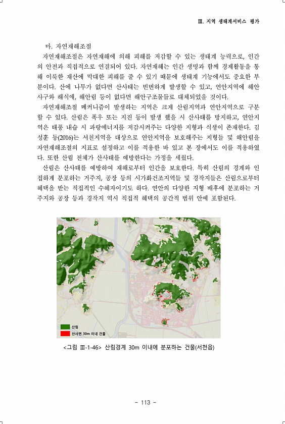 Ⅲ. 지역 생태계서비스 평가 113 마. 자연재해조절 자연재해조절은 자연재해에 의해 피해를 저감할 수 있는 생태계 능력으로, 인간 의 안전과 직접적으로 연결되어 있다. 자연재해는 인간 생명과 함께 경제활동을 통 해 이룩한 재산에 막대한 피해를 줄 수 있기 때문에 생태계 기능에서도 중요한 부 분이다. 산에 나무가 없다면 산사태는 빈번하게 발생할 수 있고, 연안지역에 해안 사구와 해식애, 해안림 등이 없다면 해안구조물들로 대체되었을 것이다. 자연재해조절 메커니즘이 발생하는 지역은 크게 산림지역과 연안지역으로 구분 할 수 있다. 산림은 폭우 또는 지진 등이 발생 했을 시 산사태를 방지하고, 연안지 역은 태풍 내습 시 파랑에너지를 저감시켜주는 다양한 지형과 식생이 존재한다. 김 성훈 등 2016 는 서천지역을 대상...