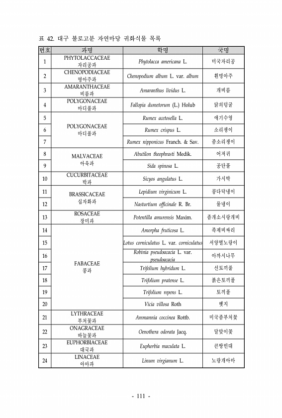 번호 과명 학명 국명 1 PHYTOLACCACEAE 자리공과 Phytolacca americana L. 미국자리공 2 CHENOPODIACEAE 명아주과 Chenopodium album L. var. album 흰명아주 3 AMARANTHACEAE 비름과 Amaranthus lividus L. 개비름 4 POLYGONACEAE 마디풀과 Fallopia dumetorum L. Holub 닭의덩굴 5 POLYGONACEAE 마디풀과 Rumex acetosella L. 애기수영 6 Rumex crispus L. 소리쟁이 7 Rumex nipponicus Franch. & Sav. 좀소리쟁이 8 MALVACEAE 아욱과 Abutilon theophrasti Medik. 어저귀 9 Sida spinosa L. 공단풀...