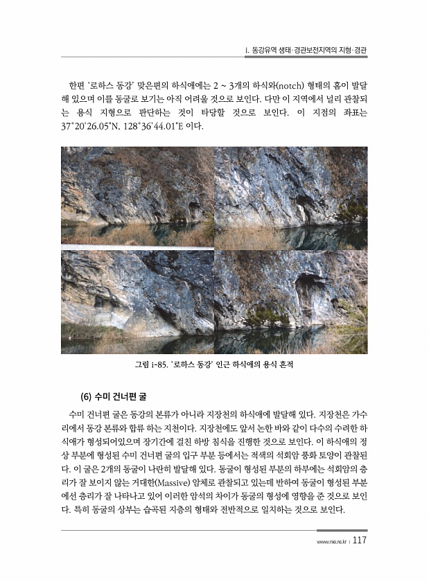 i. 동강유역 생태·경관보전지역의 지형·경관 www.nie.re.kr ?117 한편 ‘로하스 동강’ 맞은편의 하식애에는 2 3개의 하식와 notch 형태의 홈이 발달 해 있으며 이를 동굴로 보기는 아직 어려울 것으로 보인다. 다만 이 지역에서 널리 관찰되 는 용식 지형으로 판단하는 것이 타당할 것으로 보인다. 이 지점의 좌표는 37°2026.05N, 128°3644.01E 이다. 그림 i-85. 로하스 동강인근 하식애의 용식 흔적 6 수미 건너편 굴은 동강의 본류가 아니라 지장천의 하식애에 발달해 있다. 지장천은 가수 리에서 동강 본류와 합류 하는 지천이다. 지장천에도 앞서 논한 바와 같이 다수의 수려한 하 식애가 형성되어있으며 장기간에 걸친 하방 침식을 진행한 것으로 보인다. 이 하식애의 정 상 부분에 형...