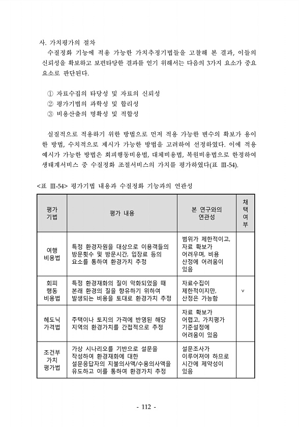 평가 기법 평가 내용 본 연관성 연구와의 채 택 여부 여행 비용법 특정 환경자원을 대상으로 이용객들의 방문횟수 및 방문시간, 입장료 등의 요소를 통하여 환경가치 추정 범위가 제한적이고, 자료 확보가 어려우며, 비용 산정에 어려움이 있음 회피 행동 비용법 특정 환경재화의 질이 악화되었을 때 본래 환경의 질을 향유하기 위하여 발생되는 비용을 토대로 환경가치 추정 자료수집이 제한적이지만, 산정은 가능함 ∨ 헤도닉 가격법 주택이나 토지의 가격에 반영된 해당 지역의 환경가치를 간접적으로 추정 자료 확보가 어렵고, 가치평가 기준설정에 어려움이 있음 조건부 가치 평가법 가상 시나리오를 기반으로 설문을 작성하여 환경재화에 대한 설문응답자의 지불의사액/수용의사액을 유도하고 이를 통하여 환경가치 추정 설문조사가 이루어져야 하...
