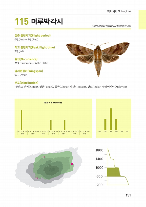 131 박각시과 Sphingidae 성충 출현시기 Flight period 6월 Jun 8월 Aug 최고 출현시기 Peak fight time 7월 Jul 출현 Occurrence 보통 Common 600-1000m 날개편길이 Wingspan 92 99mm 분포 Distribution 한반도 전역 Korea , 일본 Japan , 중국 China , 대만 Taiwan , 인도 India , 말레이시아 Malayisa Ampelophaga rubiginosa Bremer et Grey M J J A S O M J J A S O M J J A S O M J J A S O M J J A S O M J J A S O M J J A S O May Jun Jul Aug Sep Oct 2009 2010 2011 2012...
