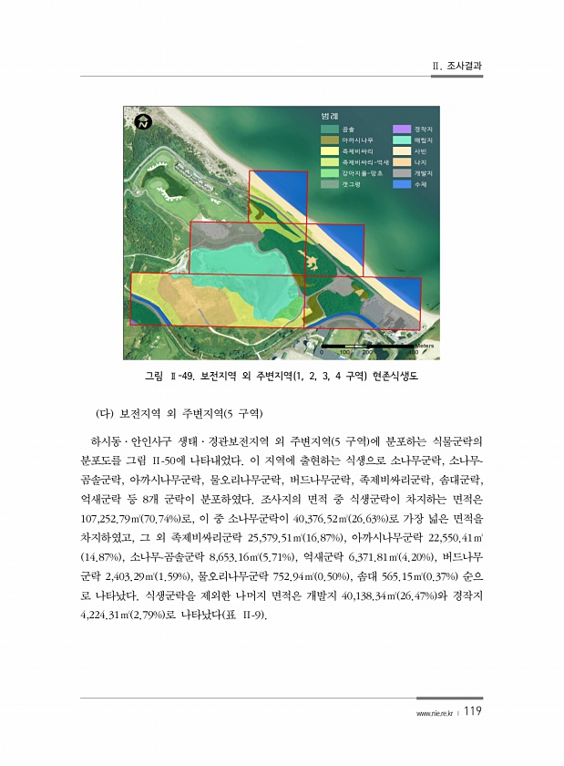 Ⅱ. 조사결과 www.nie.re.kr ? 119 그림 Ⅱ-49. 보전지역 외 주변지역 1, 2, 3, 4 구역 현존식생도 다 보전지역 외 주변지역 5 구역 하시동·안인사구 생태·경관보전지역 외 주변지역 5 구역 에 분포하는 식물군락의 분포도를 그림 Ⅱ-50에 나타내었다. 이 지역에 출현하는 식생으로 소나무군락, 소나무- 곰솔군락, 아까시나무군락, 물오리나무군락, 버드나무군락, 족제비싸리군락, 솜대군락, 억새군락 등 8개 군락이 분포하였다. 조사지의 면적 중 식생군락이 차지하는 면적은 107,252.79㎡ 70.74% 로, 이 중 소나무군락이 40,376.52㎡ 26.63% 로 가장 넓은 면적을 차지하였고, 그 외 족제비싸리군락 25,579.51㎡ 16.87% , 아까시나무군락 22,550.41㎡ 14.87...