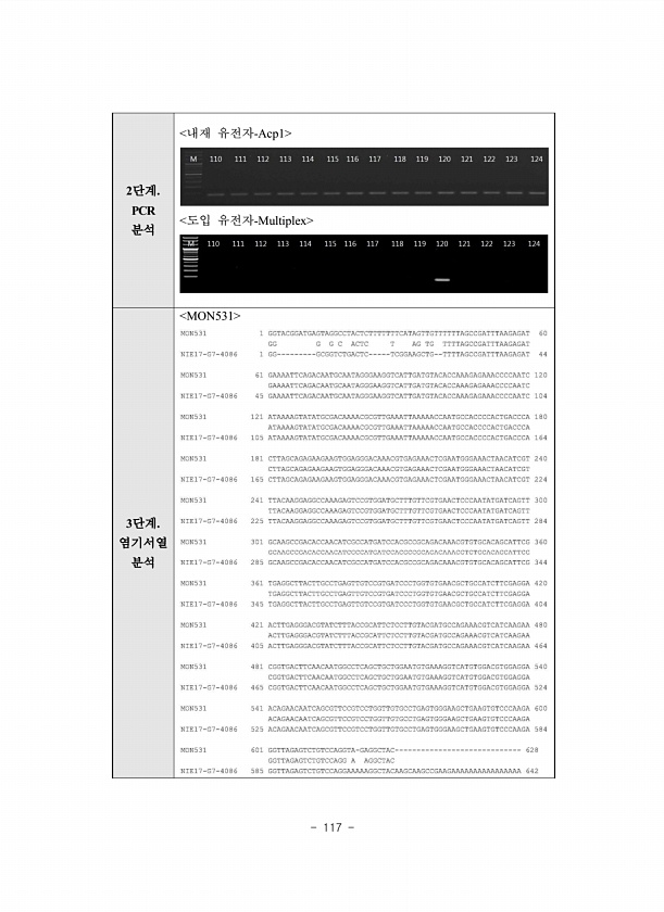 117 2단계. PCR 분석 내재 유전자-Acp1 도입 유전자-Multiplex 3단계. 염기서열 분석 MON531