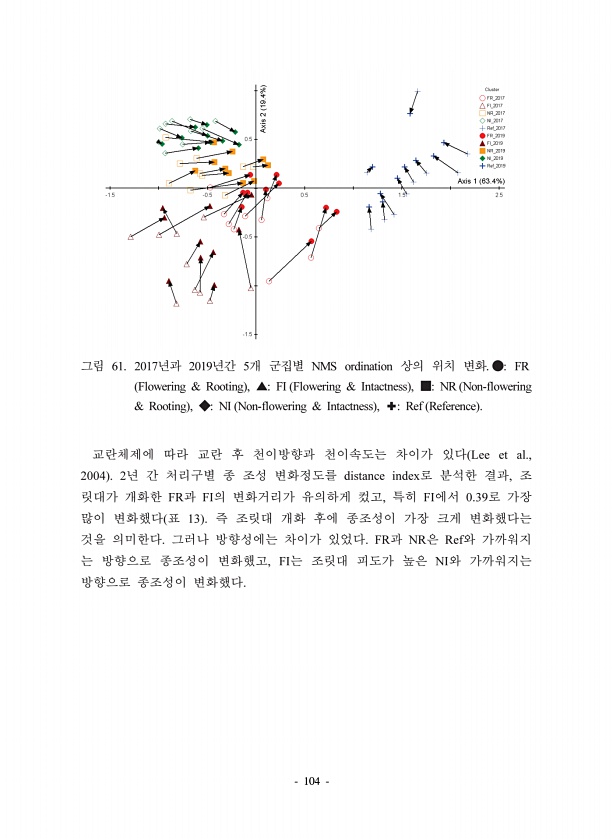 104 61. 2017 2019 5 NMS ordination FR Flowering & Rooting , FI Flowering & Intactness , NR Non-flowering & Rooting , NI Non-flowering & Intactness , Ref Reference Lee et al., 2004 2 distance index , FR FI , FI 0.39 13 FR NR Ref , FI NI