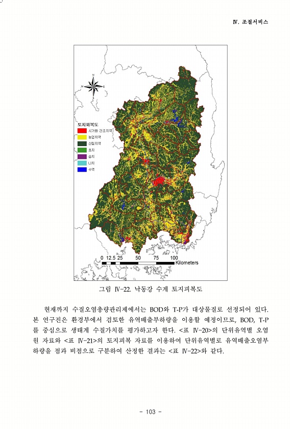 Ⅳ. 조절서비스 103 그림 Ⅳ 22. 낙동강 수계 토지피복도 현재까지 수질오염총량관리제에서는 BOD와 T-P가 대상물질로 선정되어 있다. 본 연구진은 환경부에서 검토한 유역배출부하량을 이용할 예정이므로, BOD, T-P 를 중심으로 생태계 수질가치를 평가하고자 한다. 표 Ⅳ 20 의 단위유역별 오염 원 자료와 표 Ⅳ 21 의 토지피복 자료를 이용하여 단위유역별로 유역배출오염부 하량을 점과 비점으로 구분하여 산정한 결과는 표 Ⅳ 22 와같다.