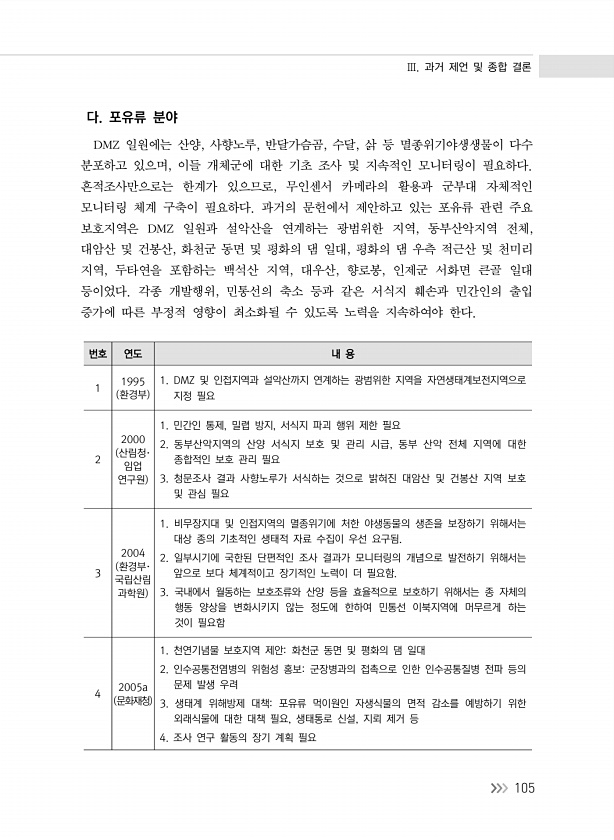 Ⅲ. 과거 제언 및 종합 결론 105 번호 연도 내 용 1 1995 환경부 1. DMZ 및 인접지역과 설악산까지 연계하는 광범위한 지역을 자연생태계보전지역으로 지정 필요 2 2000 산림청· 임업 연구원 1. 민간인 통제, 밀렵 방지, 서식지 파괴 행위 제한 필요 2. 동부산악지역의 산양 서식지 보호 및 관리 시급, 동부 산악 전체 지역에 대한 종합적인 보호 관리 필요 3. 청문조사 결과 사향노루가 서식하는 것으로 밝혀진 대암산 및 건봉산 지역 보호 및 관심 필요 3 2004 환경부· 국립산림 과학원 1. 비무장지대 및 인접지역의 멸종위기에 처한 야생동물의 생존을 보장하기 위해서는 대상 종의 기초적인 생태적 자료 수집이 우선 요구됨. 2. 일부시기에 국한된 단편적인 조사 결과가 모니터링의 개념으로 발전하기 ...