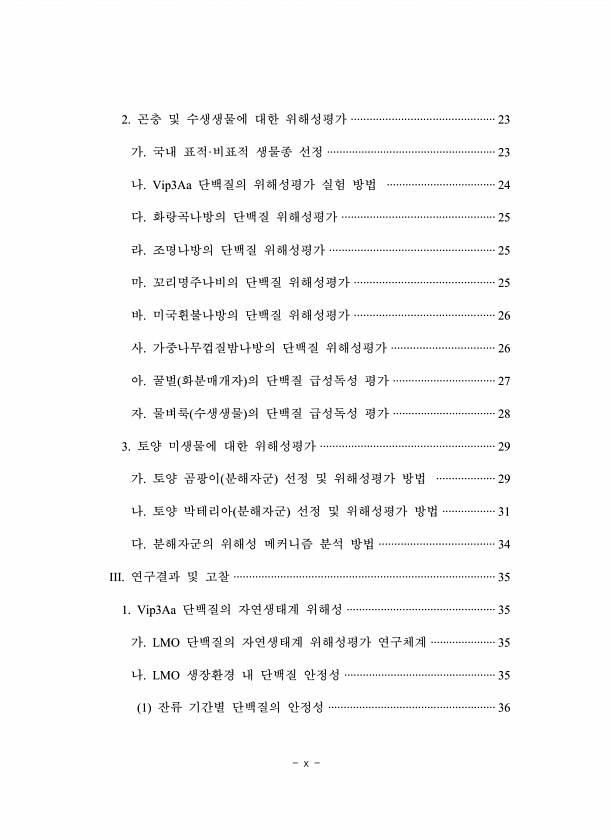 x 2. 곤충 및 수생생물에 대한 위해성평가 ·············································· 23 가. 국내 표적·비표적 생물종 선정 ······················································ 23 나. Vip3Aa 단백질의 위해성평가 실험 방법 ··································· 24 다. 화랑곡나방의 단백질 위해성평가 ················································· 25 라. 조명나방의 단백질 위해성평가 ····················································· 25 마. 꼬리명주나비의 단백질 위해성평가 ···········...