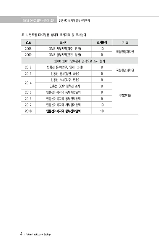 2018 DMZ 일원 생태계 조사 민통선이북지역 중부산악권역 4 ? National Institute of Ecology 연도 조사지 조사분야 비 고 2008 DMZ 서부지역 파주, 연천 10 국립환경과학원 2009 DMZ 중부지역 연천, 철원 9 20102011 남북관계 경색으로 조사 불가 2012 민통선 동부 양구, 인제, 고성 9 국립환경과학원 2013 민통선 중부 철원, 화천 9 2014 민통선 서부 파주, 연천 9 국립생태원 민통선 GOP 철책선 조사 9 2015 민통선이북지역 동부해안권역 9 2016 민통선이북지역 동부산악권역 9 2017 민통선이북지역 서부평야권역 10 2018 민통선이북지역 중부산악권역 10 표 1. 연도별 DMZ일원 생태계 조사지역 및조사분야